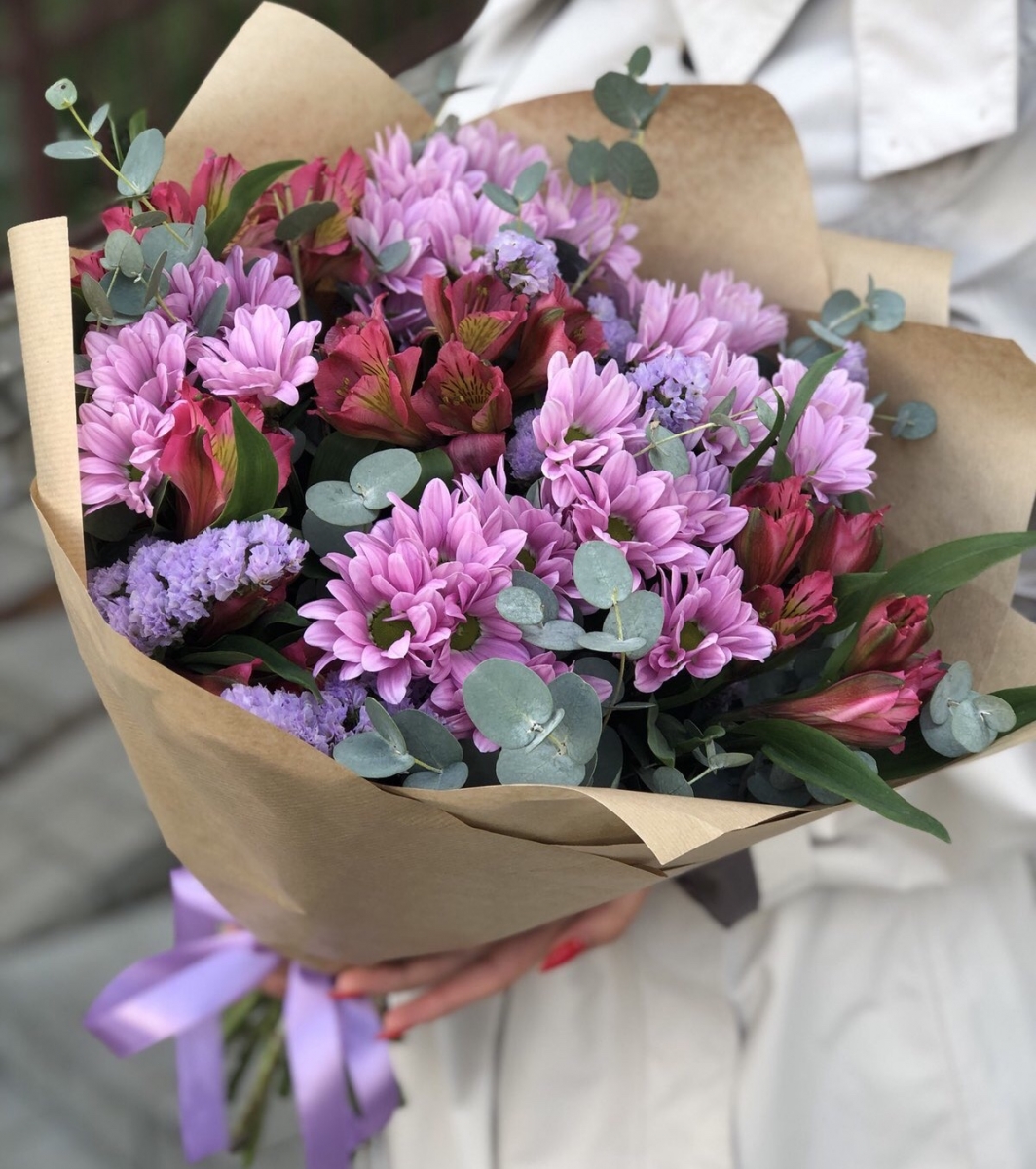 Состав: Хризантема кустовая(4), Альстромерия(4), Статица(2), Эвкалипт(2), Оформление